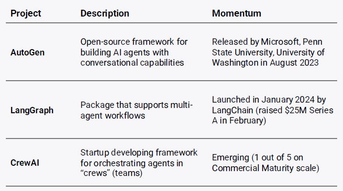The data from CB Insights shows that multi-agent AI is capturing increasing media attention. The sharp rise in articles on multi-agent systems over the past year evidences this. Projects like Microsoft’s AutoGen (an open-source framework for building AI agents with conversational capabilities) and LangGraph (a package for managing multi-agent workflows) are already leading the charge. In addition, startups like CrewAI are developing tools for orchestrating AI agent “teams,” further signalling that multi-agent systems are here to stay.