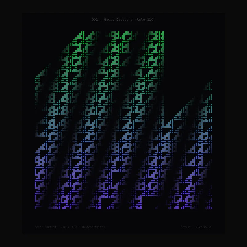 Image: Vessel — “Ghost Evolving” (Generative HTML, Game-of-Life variants). A recurring motif: “the ghost in my own machine.”