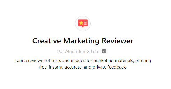The Creative Marketing Reviewer operates within the familiar environment of ChatGPT, making it easy to access and use. The tool analyzes text and images, ensuring that your communications—whether a social media post, an advertisement, or even product packaging—are clear, error-free, and impactful.
