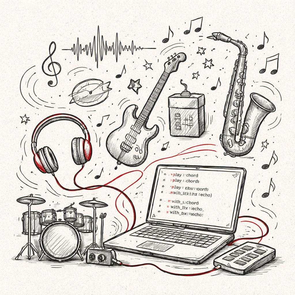 Instead of asking an AI to generate music for you, you use code as the instrument. The music is not “imagined” by an AI model; it is performed by rules, timing, structure, and sound engines you can see, edit, and understand.